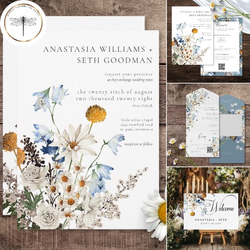 Rustic Dusty Blue Wildflowers & Daisies Dinner All In One Invitation