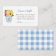 Flowers in Autumn tones (reds, oranges, yellows) in a preppy ginger jar vase for this baby shower enclosure card design. The reverse features a gingham check in white and mid blue (you can change the blue to any other colour by entering the design tool and changing the background colour).