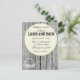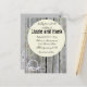 Rustic grey weathered planks of wood is the backdrop of this charming wedding invite. A decorative wreath of flowers, hearts and lace decorate the bottom of card and a round decorative sphere with leaves and flowers are centre of card with all the information. Country chic at its finest.