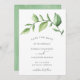 Rustic save the date card featuring a simple design with a green watercolor painted sprig with large leaves, over a white background. Below are your details in a soft grey and the backside has a light green watercolor wash. An elegant botanical design that is great for a celebration in the summer.