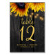 Rustic country elegant wedding table number with editable text featuring big sunflowers and a chic gold script on a dark brown barn wood background with string lights. Ideal for your summer or autumn fall garden backyard outdoor or farmhouse wedding.