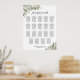 This wedding seating chart is rustic and homey yet stylish and elegant. It features a hand painted watercolor boho chic design with sprigs of eucalyptus leaves, greenery and foliage in shades of mint, moss, and sage green. It includes table assignments for 19 tables at 10 seats per table for a total of 190 guests. The lacy script calligraphy title reads: Please find your table, and the names of the couple and wedding date appear at the bottom. Wonderful way to help your guests find their seats while adding elegance and style to your reception.