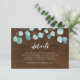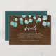 This rustic wedding details card features eucalyptus leaves with the words "details" in trendy script all against a brown wood background on the front and a dark teal green colour back side.
