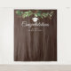 A beautiful photo backdrop to add something extra to your graduation party. This design features an arrangement of green watercolor eucalyptus on a painted dark wood and a white and gold graduation cap underneath. "Congratulations" is in white cursive font and your name and class/date is also in white sans serif font.