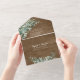 This rustic boho eucalyptus all-in-one wedding invitation includes the invitations itself, and a tear-away RSVP postcard for ease of return by your guests. The text templates are framed by bouquets of watercolor eucalyptus greenery, with a rustic brown wood background.