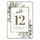Make your wedding reception beautiful with these table number cards. They feature a beautiful design with a lacy script calligraphy surrounded by a bounty of eucalyptus leaves and pine branches in shades of sage green and gold. There is space for the names of the couple and wedding date as well as the table number.