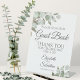 This beautiful pedestal sign will invite your wedding guests to sign your guest book. Features a rustic boho chic design with hand painted sprigs of watercolor eucalyptus leaves in shades of mint, moss, and sage green. There is space for the names of the couple as well as the wedding date.