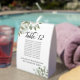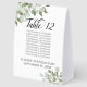These beautiful table number tent signs include a seating chart or list of ten names to help your guests find the correct table at your wedding reception. The rustic hand painted watercolor design features sprigs of eucalyptus leaves and greenery in shades of mint, moss, and sage green. The title is written in elegant script calligraphy with room for the names of couple and wedding date below.