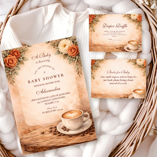 Warm, cozy, and full of autumn charm, this “A Baby Is Brewing” design blends soft neutral florals with rich coffee accents for the perfect rustic celebration. Featuring vintage parchment texture, warm beige and caramel tones, delicate roses, coffee beans, and a steaming cup detail, it creates an inviting café-inspired atmosphere. Ideal for fall gatherings, brunch themes, or coffee-loving moms-to-be, this design feels intimate, stylish, and effortlessly charming.