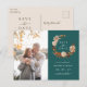 Rustic Fall Floral Photo Announcement Postcard. Celebrate your upcoming wedding with this personalised save the date photo card. A favourite engagement photo takes centre stage, framed by elegant accents of watercolor leaves in rich terracotta, burnt orange, and copper tones, paired with soft beige florals. Set on a vibrant teal background, this card beautifully blends modern personalisation with classic fall design. Upload your photo and begin your journey with unforgettable style.