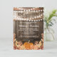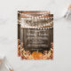Rustic autumn housewarming party invitations featuring a country barn oak wood barrel background, twinkle string lights, fall leaves, a harvest pumpkin, and a home sweet home party template that is easy to personalise.