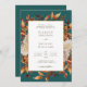 Teal Terracotta Fall Leaves Wedding Invitation. This elegant wedding invitation features beautiful hand-painted watercolor burnt orange, copper, terracotta leaves, cream and beige dahlias, and beautiful rust and brown roses on a teal background; perfect for an autumn wedding! The back of the invite has a beautiful branch of leaves with the bride and groom's monogram. Find matching items in the Teal Autumn Romance Wedding Collection.