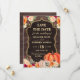 Rustic Fall Orange Pumpkin floral design with orange and red flowers on a dark brown wood background