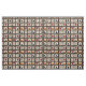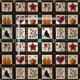 This fabric showcases a rustic quilt-inspired pattern arranged in squares and rectangular blocks with warm autumn motifs. The patchwork features pumpkins, a black bird with a reddish breast, hearts, red stars, and floral branches in earthy shades of red, orange, and brown. Geometric accents like plaid and cross-stitch textures add to the handmade feel. With a cosy farmhouse aesthetic in black, cream, and fall tones, this pattern is perfect for autumn décor, primitive country style, and rustic harvest season charm.