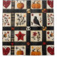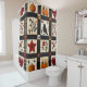 This shower curtain showcases a rustic quilt-inspired pattern arranged in squares and rectangular blocks with warm autumn motifs. The patchwork features pumpkins, a black bird with a reddish breast, hearts, red stars, and floral branches in earthy shades of red, orange, and brown. Geometric accents like plaid and cross-stitch textures add to the handmade feel. With a cosy farmhouse aesthetic in black, cream, and fall tones, this pattern is perfect for autumn décor, primitive country style, and rustic harvest season charm.