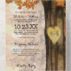 A 3 in 1 autumn woodland wedding trifold invitation featuring a rustic fall tree covered in red, orange and yellow leaves, a carved heart with your initials, string twinkle lights, wedding details, wedding invite, and a meal rsvp postcard for your guests to tear off and send back.