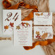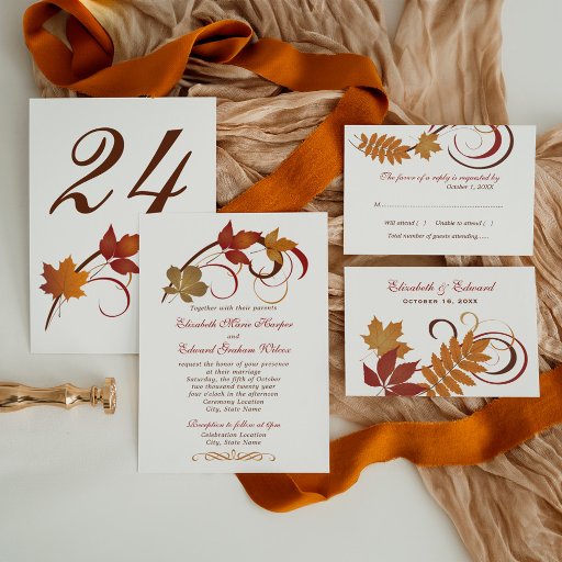 Elegant fall-themed wedding card design. Our "Falling Leaves" wedding stationery features saturated fall foliage and scrolling swirls. Colours include orange, copper, brown, red and gold.