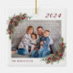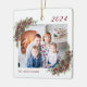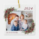 This beautiful classic Christmas ornament features a photo on the front and the back, framed in 2 corners with bouquets of watercolor pine cones, greenery sprigs, and holly berries. The family name and year date is on each side, and the background is white, with dark red burgundy text colour. Check out the collection for many matching products, or contact me through Zazzle Chat if you would like additional matching products or other colorways.