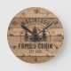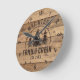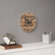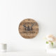 Create a personalised family cabin wall clock featuring a rustic, country wood plank design with forest pine trees in the woods and NAME FAMILY CABIN and year established date or other text in brown. The sample is shown in the 8-inch round option; choose 10.75-inch or square on the ordering page. ASSISTANCE: For help with design modification or personalisation, transferring the design to another product or if you would like coordinating items, contact the designer BEFORE ORDERING via the Zazzle Chat MESSAGE tab below or email makeitaboutyoustore@gmail.com.