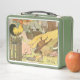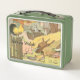 Rustic farm animals personalised lunch box. All the animals on the farm. Rooster sits on a fence looking over the barn yard animals with a pig, hens and baby chicks, a dog in his kennel, a cat, a goat and the cow. Personalise the text of the lunch box with your child's name or delete the text. Edit both the front and back text, which can be different - first name last name or just last name.
