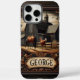 Rustic farmhouse with barn, horses, glowing light, wooden fence, green grass. Name 'George' carved into frame