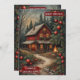 A rustic farmhouse is an experience. At the core of this holiday style is vintage texture, whitewashed wood, reclaimed planks, burlap ribbons, galvanized metal, frosted pinecones, and soft wool knits. Inside, the scent of cinnamon, pine, and warm pastries fills the air, blending with the crackle of the fireplace. The illustration has a country cottage with pine trees decorated with Christmas holly berry and a greenery wreath. Reverse side has a similar design. The card has warm greeting and wishes that can be personalized on front and reverse sides.