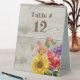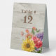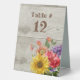 Rustic tent style wedding table number sign done in a light wood fence background, with vintage graphics of a colourful flower bouquet. Personalise the text for each table at your reception.