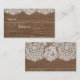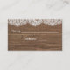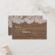 This rustic wedding invitation suite features a wood grain background with a delicate piece of white lace at the top.