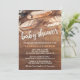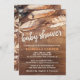 Rustic woodsy baby shower invitations with watercolor feathers on a wood grain background.