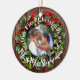 Holly Wreath "Our First Christmas as Mr and Mrs" Wedding Photo Beautiful keepsake gift, with photo and custom text on back. Ornament in red and green holiday Christmas wreath with your custom photo and rustic wood plank background! Add your personalised message on back as well. Vibrant and colourful beautiful keepsake family christmas ornament. Share the Holidays with these personalised ornaments, sure to be a great conversation starter.