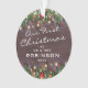 Personalised newlyweds rustic christmas ornament featuring a dark wooden background, festive christmas tree branches, red & gold tree decorations, string twinkle lights, the adorable saying 'our first christmas as mr & mrs', your name, and the year. On the reverse is a photo of their grandchild.