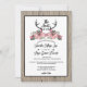 Unique rustic country style deer antlers + vintage pink roses flowers floral graphic + typography design against a barnwood backdrop. Please personalise it with your own text occasion-accordingly or click the "Customise It" button to go to the design tool where you can add text, change the font, text size, text colour, text positioning and more. **Matching RSVP, postage, address labels, favours-stickers, reception cards, menus, thank you notes, programs, table numbers, and place cards are all available upon request.