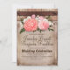 Rustic oak barrel wood and burlap lace vineyard wedding invitation with the vintage pink and white country flowers bouquet.