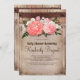 Old rustic barn oak barrel wood and distressed burlap lace baby shower invitation with the vintage pink and white country flowers bouquet.