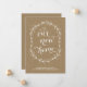 This elegant, rustic "new home" announcement features a pretty floral wreath, calligraphy, and the text "Our new home," against a kraft paper-style background.
