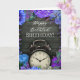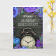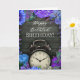 This belated birthday card features a rustic dark wood background that adds a warm, natural texture to the design. At the center is a classic vintage-style alarm clock, symbolizing time gently passing, making it a meaningful choice for late birthday wishes. Surrounding the clock is a vivid floral border in rich shades of blue, purple, lilac, and teal, creating a striking contrast against the wooden backdrop.