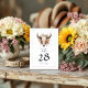 Elevate your rustic or southwestern-themed wedding decor with this beautifully designed table number card. Featuring a floral cow skull illustration adorned with soft roses and greenery, this card combines boho charm with rustic elegance. Perfect for guiding guests to their tables while adding a unique decorative touch. Personalise with your table numbers and the couple’s names for a cohesive wedding aesthetic.