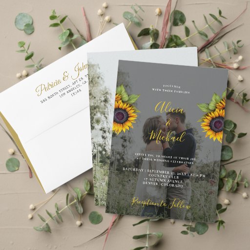 Modern elegant script yellow sunflowers weddingDesigned by Anka Designs