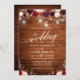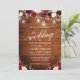 Rustic Wood, Modern Calligraphy Script, Watercolor Burgundy Marsala Floral Wedding Invitation with Burgundy and Pink Roses. Glowing String Lights with Mason Jars. Photo Back.