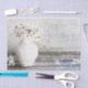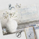 Beautiful design featuring white flowers in a white vase with vintage ephemera in shades of blue and grey.