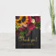 Rustic elegant wedding stylish thank you template card on dark brown barn wood background featuring beautiful sunflower and burgundy roses bouquets. F+++++++++++++++++++ Suitable for elegant summer or autumn fall rustic countryside farmhouse barn garden backyard weddings.