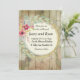 Wooden planks makes a rustic backdrop for this wedding invite. The main theme is the ornate decorative wreath with flowers, leaves and fancy gold lacing. Country charm at its finest.