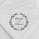 Custom-designed wedding stamp featuring modern hand calligraphy with hand-drawn floral wreath. Personalize with bride and groom's names and wedding date. Perfect for rustic, country, and boho themed weddings.