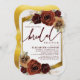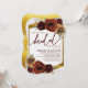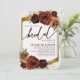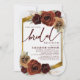 This bridal shower invitation features rustic oil painted burgundy earthy toned autumn fall flowers over greenery and pampas grass with an elegant gold foliage frame and background.