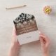 A rustic all in one wedding invitation featuring pretty watercolor greenery foliage, string lights, mason jars and elegant modern typography on a wood panels background. The invitation includes a perforated RSVP card that can be individually addressed or left blank for you to handwrite your guest's address details. Designed by Thisisnotme©