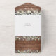 A rustic all in one wedding invitation featuring pretty watercolor greenery foliage, string lights, mason jars and elegant modern typography on a wood panels background. The invitation includes a perforated RSVP card with your wedding website QR code and details. Designed by Thisisnotme©