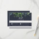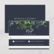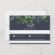 Rustic forest foliage arrangement, wedding RSVP cards, with solid navy blue colour background, and food allergy note.