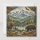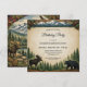 This rustic forest themed birthday party design features a warm parchment style background framed by snow capped mountains and a line of evergreen trees. Pinecones and antlers accent the top border, while a moose and black bear stand at the base, creating a cozy woodland atmosphere. The earthy palette of deep green, brown, cream, and muted blue enhances the lodge inspired style. Elegant script lettering highlights the words Birthday Party, paired with classic serif text for the event details. The overall composition evokes a charming outdoor celebration perfect for a nature loving guest of honor.