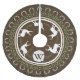 Intricate deer hunting themed Christmas tree skirt in hues of forest green, brown, tan, and white. The tree skirt features decorative nature inspired elements as well as white deer silhouettes and antlers accents. This tree skirt would make an excellent tree skirt for a hunting family!