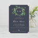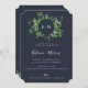 Rustic forest foliage, engagement party invitation. Card design features, watercolor leafy branches in shades of green and blue. Monogram greenery wreath and elegant typography template design. Background colour of card, shown in solid navy blue.